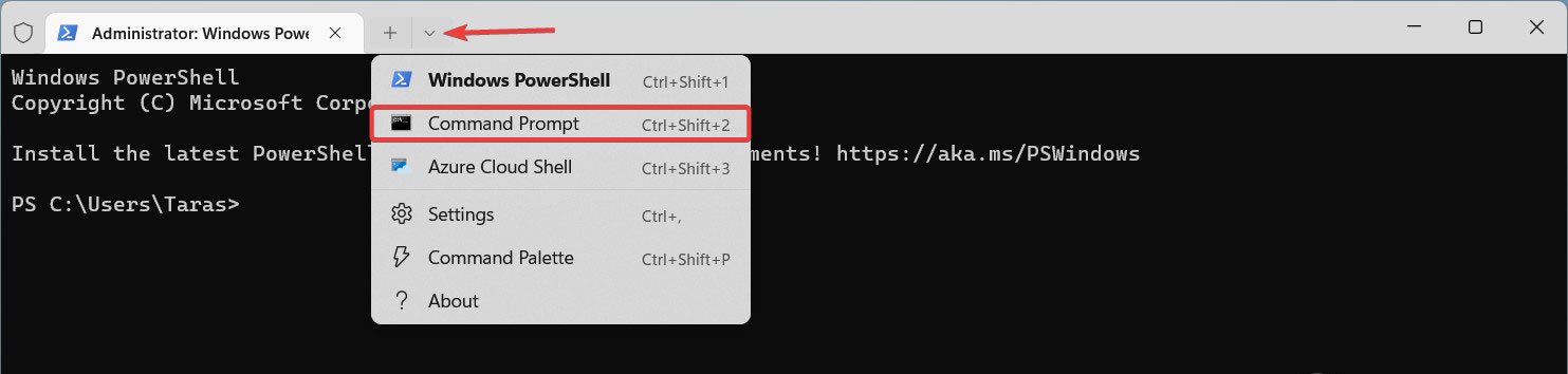 Bước 3: Chuyển Windows Terminal sang cấu hình Command Prompt bằng phím tắt Ctrl + Shift + 2, hoặc bằng cách nhấp vào nút mũi tên xuống ở đầu cửa sổ.