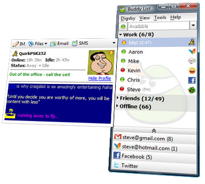 Từ khi Digsby xuất hiện, đây là một chương trình IM phổ thông, giống như Trillian và Pidgin nhưng nó có thể thực hiện tốt hơn một số công việc, ví dụ cho phép bạn có thể kiểm tra các trang mạng xã hội và tài khoản email.