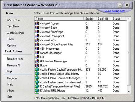 Free Internet Window Washer có thể khắc phục được vấn đề này và bảo vệ được sự riêng tư của bạn bằng cách xóa sạch sẽ các dấu vết này. Không chỉ remove các dấu vết hành động trên Internet mà nó còn có thể xóa các dấu vết của hành động trong ứng dụng mà bạn đã thực hiện như file nào đã mở gần đây trong các ứng dụng Microsoft Office. Nó cũng làm việc với nhiều trình duyệt khác nhau như Internet Explorer, Firefox, Netscape và Opera.