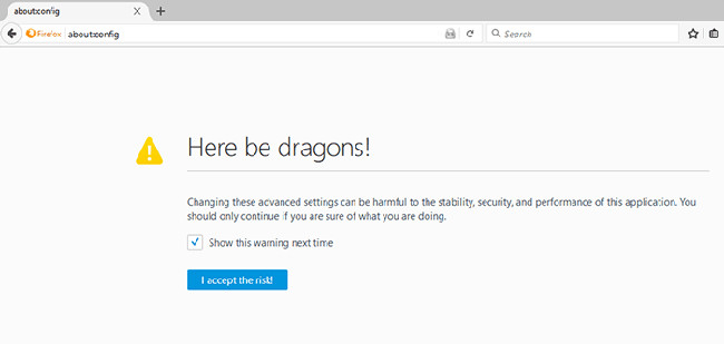 Thông báo "Here be dragons” sẽ hiện lên khi bạn gõ about:config vào thanh địa chỉ URL của Firefox, cảnh báo bạn rằng những điều chỉnh trong khu vực này phần lớn là thử nghiệm và có thể gây ra sự không ổn định cho trình duyệt của bạn.