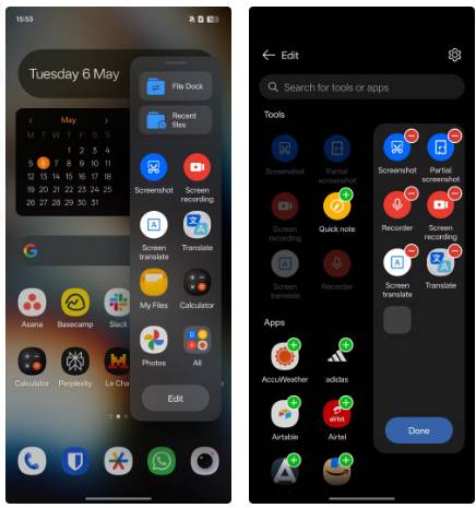 Tùy chỉnh Smart Sidebar trên điện thoại OnePlus cũng rất dễ dàng. Vuốt vào trong thanh dọc xuất hiện ở cạnh phải phía trên màn hình để hiển thị Smart Sidebar. Nhấn vào biểu tượng - ở trên cùng của các ứng dụng hoặc công cụ để xóa chúng khỏi thanh bên. Nếu bạn muốn thêm các ứng dụng và công cụ mới, hãy nhấn vào biểu tượng + ở trên cùng của chúng.