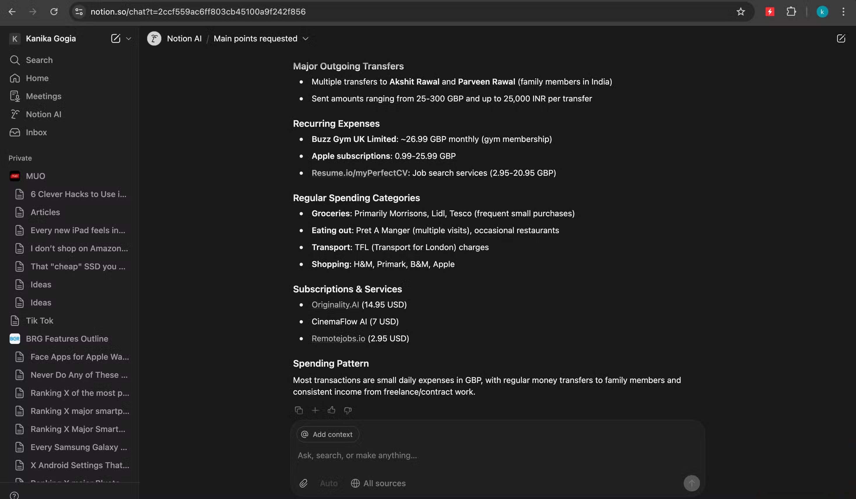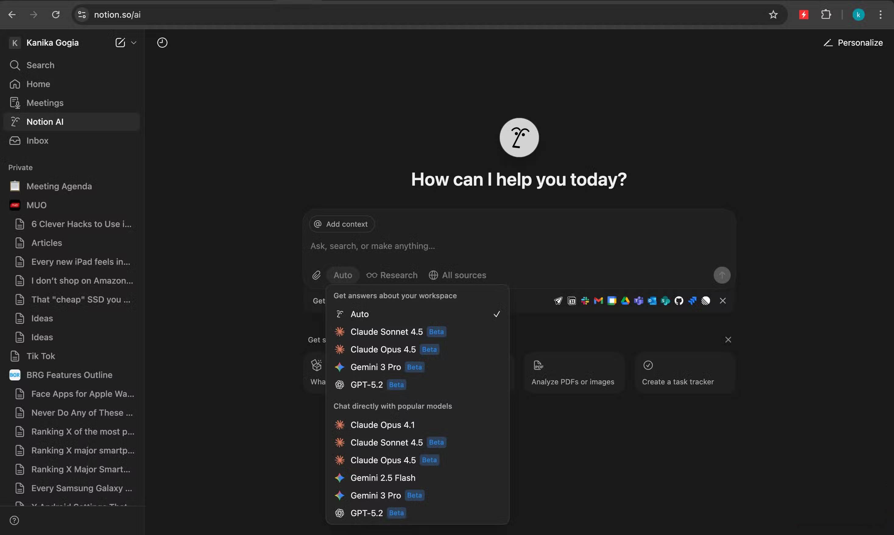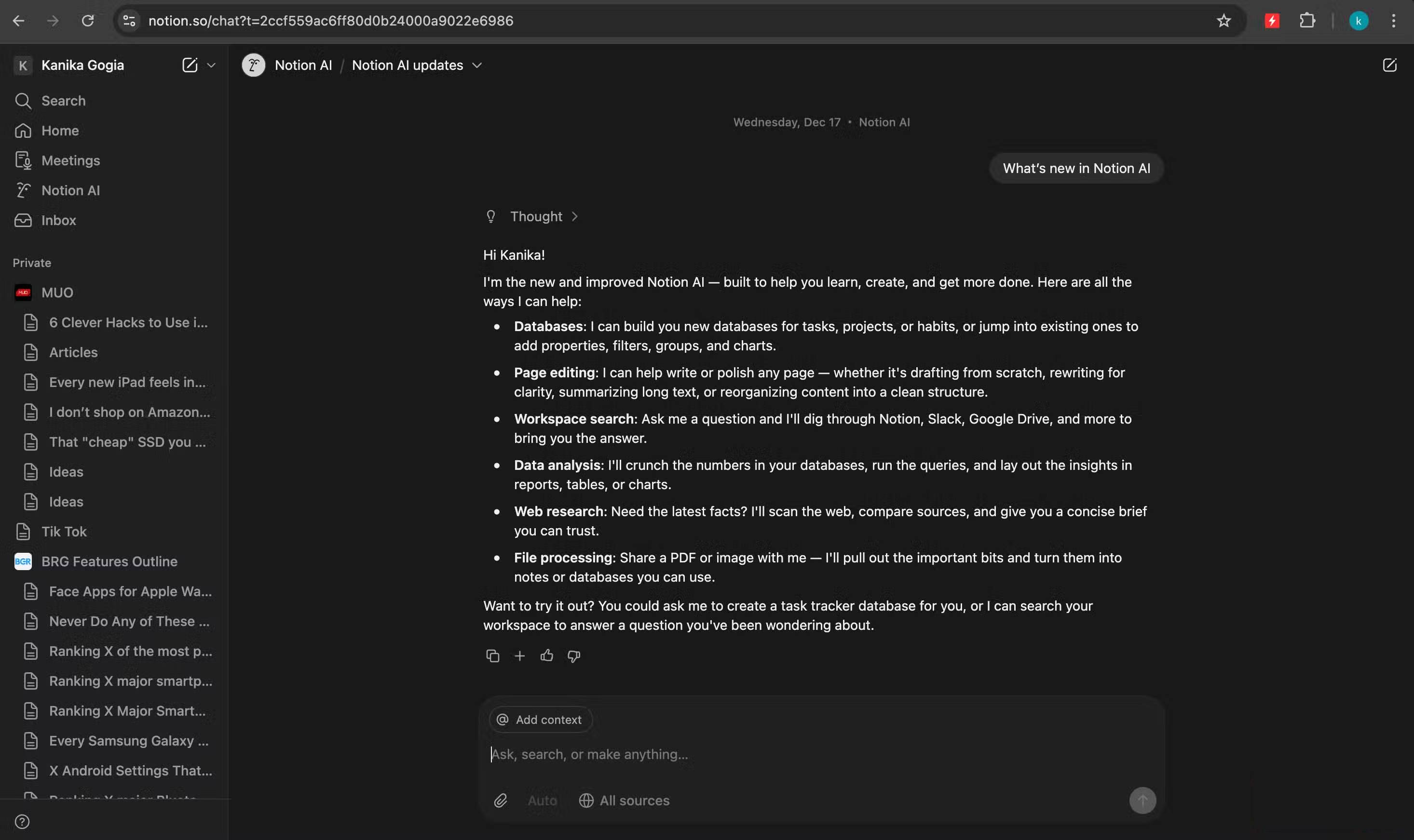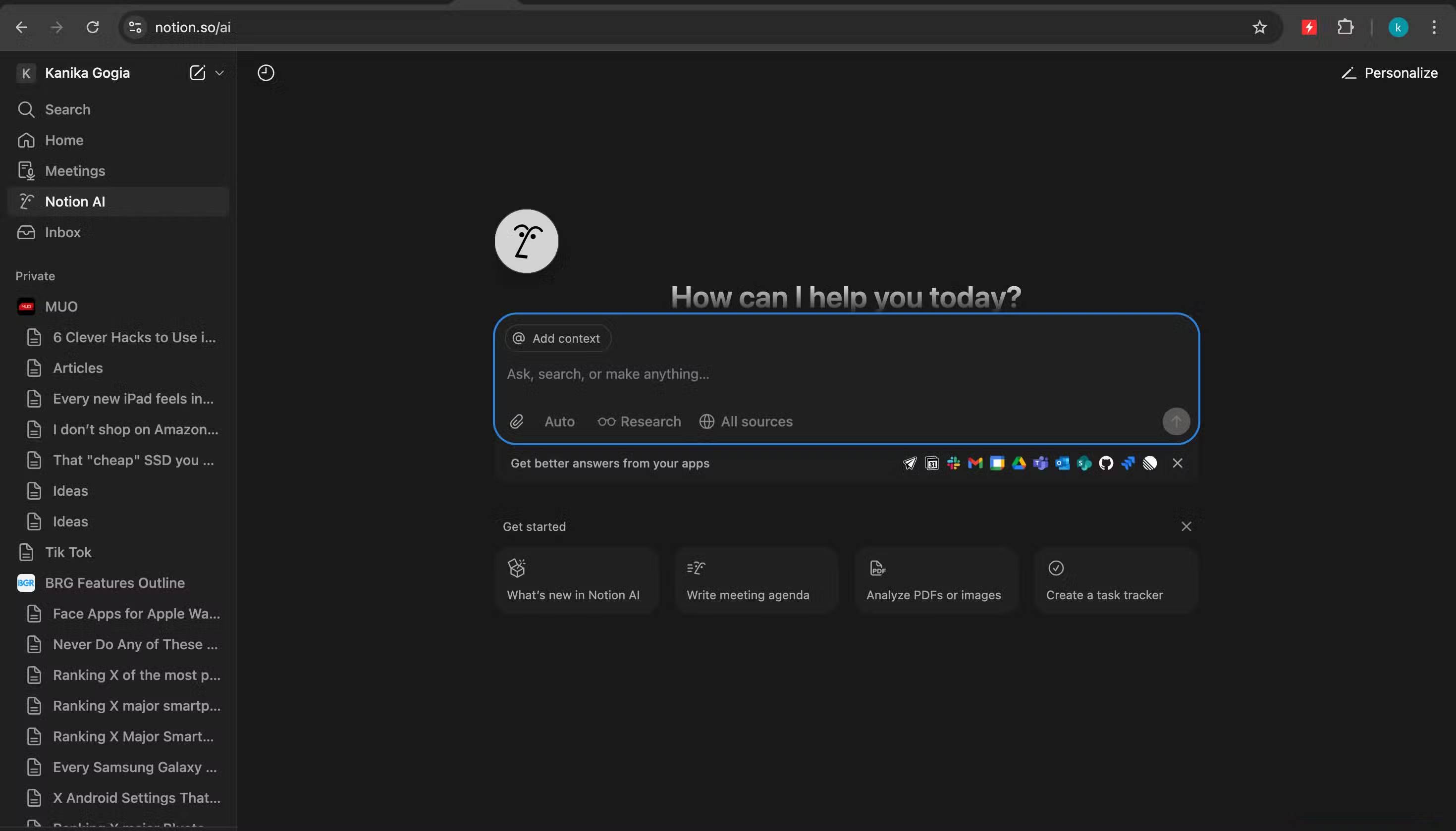 Bạn có thể soạn thảo bài đăng blog, lên ý tưởng, dịch một trang sang ngôn ngữ khác và làm nhiều hơn nữa. Bạn cũng có thể đặt các câu hỏi cụ thể từ không gian làm việc của mình hoặc những ứng dụng được kết nối như Slack và Google Drive. Ví dụ, bạn có thể hỏi, “Những đề xuất nào của tôi đã được chọn lọc?” và Notion AI sẽ quét cuộc trò chuyện Slack gần đây của bạn để tìm ra kết quả phù hợp. Notion AI cũng có thể giúp bạn cải thiện thiết kế hoặc phân tích tài liệu PDF và tìm ra những điểm chính cho bạn.