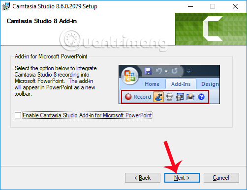 Camtasia Studio sẽ gợi ý cho người dùng cài đặt add-in vào PowerPoint, nếu không có nhu cầu thì bỏ tích ở bên dưới, rồi click tiếp vào nút Next.