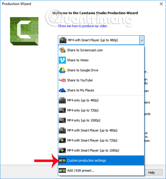 Ở trong giao diện mới, xuất hiện danh sách các độ phân giải để chúng ta lựa chọn. Có thể lựa chọn Custom production settings.