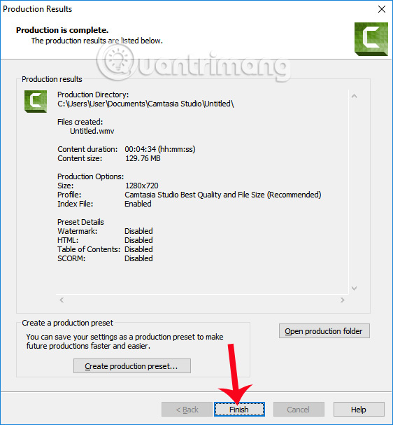Ở giao diện này chúng ta đặt tên cho video, lựa chọn thư mục xuất video hoặc có thể giữ nguyên như thiết lập, rồi nhấn Finish bên dưới để hoàn thành các bước thiết lập cho video xuất ra.