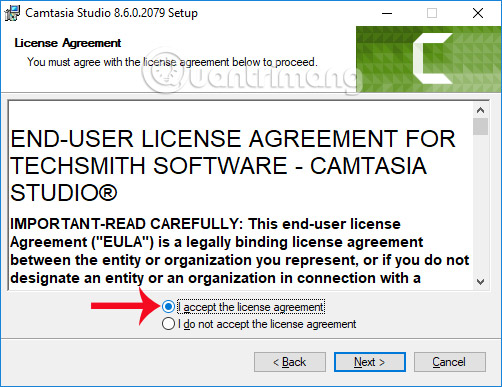 Sau đó tích chọn vào I accept the license agreement để đồng ý với điều khoản cài đặt.