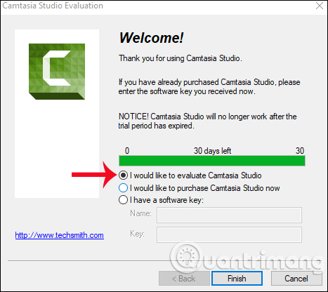 Khi click vào biểu tượng Camtasia Studio trên màn hình, một giao diện hiện ra, tích chọn vào I would like to evaluate Camtasia Studio để sử dụng bản dùng thử. Nhấn Finish để hoàn tất.