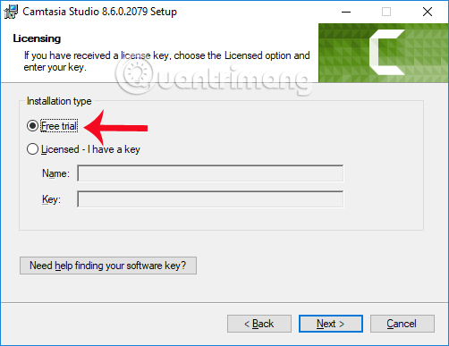 Tiếp đến do bạn đang sử dụng bản Camtasia Studio dùng thử nên tích chọn vào mục Free trail.