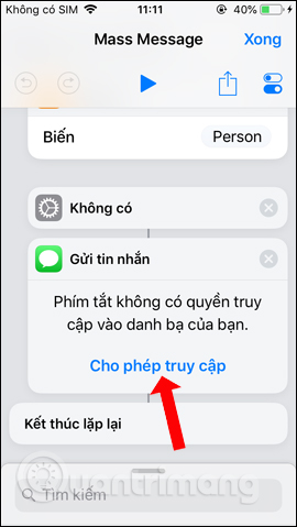 Ngay sau đó giao diện danh bạ trên iPhone xuất hiện. Tích chọn vào những số liên hệ muốn gửi tin nhắn rồi nhấn nút Xong ở góc phải trên cùng. Sau đó phím tắt sẽ tiến hành gửi tin nhắn tới các số đã chọn cùng lúc.