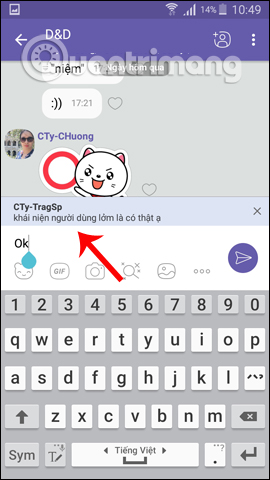 Ngay sau đó bạn sẽ nhìn thấy tin nhắn muốn trả lời xuất hiện ở khung nhập tin nhắn. Chúng ta chỉ cần nhập tin nhắn muốn chat, rồi nhấn Gửi. Tin nhắn sẽ kèm theo tên tài khoản Viber và tin nhắn muốn trả lời, như hình dưới đây.