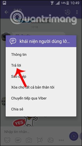 Mở giao diện nhóm chat trên Viber. Để trả lời tin nhắn nào đó bạn nhấn và giữ vào tin nhắn rồi chọn Trả lời trong danh sách tùy chọn xuất hiện.