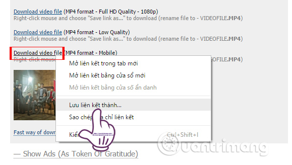 Bạn sẽ thấy Savevideo.me hỗ trợ tải video với nhiều chất lượng khác nhau. Để tải video Vimeo, chúng ta click chuột phải vào dòng Download video file rồi nhấn Lưu liên kết thành... (Save link as...).