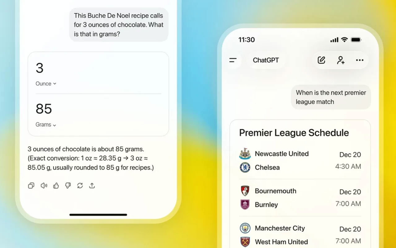 Rất nhiều người hiện nay vẫn dựa vào Google Search cho các tác vụ nhanh như đổi đơn vị đo, quy đổi tiền tệ hay tính toán múi giờ. ChatGPT sắp bổ sung các công cụ trực quan tương tự, cho phép người dùng điều chỉnh giá trị chuyển đổi một cách linh hoạt. Với thông tin thể thao trực tiếp, thay vì trả về văn bản đơn thuần, ChatGPT sẽ hiển thị tỷ số theo giao diện trực quan mới, dễ theo dõi hơn.