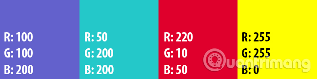 Trong hình trên, bạn có thể thấy màu tím, ngọc lam, màu đỏ nhạt và vàng được tạo ra bằng cách kết hợp các giá trị khác nhau của màu đỏ, xanh lá cây và xanh lam. Ngoài việc sử dụng cho mục đích chuyên nghiệp, hầu hết các màu RGB được cung cấp theo 8-bit cho mỗi định dạng kênh. Điều này có nghĩa là có 256 giá trị màu (0 đến 255) cho mỗi kênh màu đỏ, xanh lục và xanh lam, cung cấp tổng cộng 16.777.216 màu có thể.