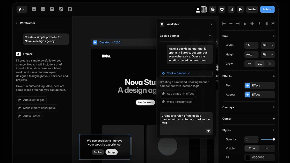 Framer là công cụ nổi bật trong việc biến prompt thành landing page chuyên nghiệp. AI của Framer hỗ trợ tạo layout và nội dung, đồng thời cung cấp thiết kế hiện đại ngay từ đầu.