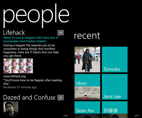 Windows Phone vốn được xây dựng hướng đến người dùng mạng, nên được tích hợp rất mạnh về email và các mạng xã hội. Ứng dụng People gom cả ba mạng xã hội phổ biến nhất hiện nay là Facebook, Twitter và LinkedIn về một nơi. Vậy nên bạn không cần mở từng ứng dụng riêng cho từng mạng xã hội mà vẫn có thể cập nhật trạng thái và xem các tin tức mới nhất về bạn bè, người thân của mình.