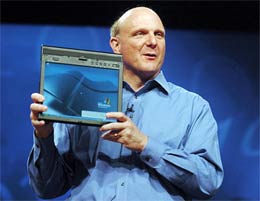 Giám đốc điều hành Steve Ballmer của Microsoft đang giới thiệu máy tính bảng ThinkPad X41 mới của tập đoàn Trung Quốc Lenovo. Ballmer cho biết chiếc tablet này sẽ chạy trên hệ điều hành Windows XP Tablet PC Edition 2005.
