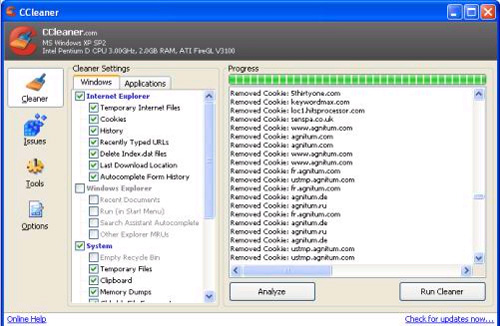 Để đảm bảo những thông tin cá nhân này không bị sử dụng trái phép thì bạn nên sử dụng công cụ miễn phí CCleaner.Công cụ cho phép bạn nhiều tùy chọn để xóa bỏ tất những thông tin cá nhân,những dấu vểt trên web như file temp,Cookies,history....Bạn có thể tải tại đây.