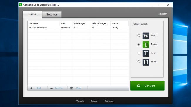 Kéo tài liệu của bạn vào cửa sổ đơn giản, gọn gàng, chọn Image từ danh sách bên phải, sau đó click vào tab Settings. Đảm bảo chọn JPG (các định dạng ảnh khác bao gồm GIF, BMP và TIFF), chọn độ phân giải hình ảnh (72 hoặc 96) và một color profile (1, 8 hoặc 24 bit). Quay trở lại tab Home, click vào Convert, chọn đầu ra và chuyển đổi sẽ hoàn thành một cách nhanh chóng.