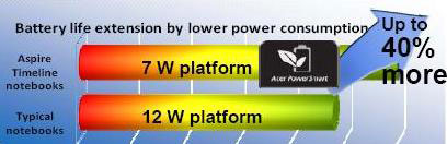 Trong khi phần lớn những chiếc máy tính xách tay khác dùng pin lớn để có thời gian sử dụng lâu khiến thân máy bị gồ lên, thì Acer kết hợp phần lớn các phụ kiện (thành phần) tiết kiệm điện năng với bộ pin chuẩn 6 cell giữ cho thiết kế nhỏ gọn nhất có thể.