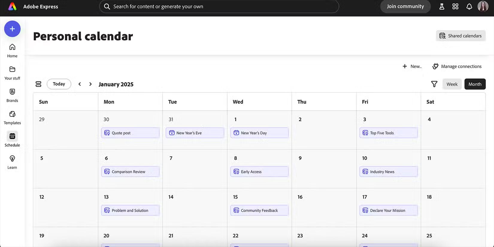 Lịch của Adobe Express cung cấp cho bạn một lý do khác để sử dụng nó cho mạng xã hội. Bạn không chỉ có thể thiết kế hầu hết các hoạt động tiếp thị kỹ thuật số hoặc sáng tạo của mình trực tiếp trên Express mà còn có thể sử dụng công cụ này để loại bỏ gánh nặng khi đăng các sáng tạo của mình.