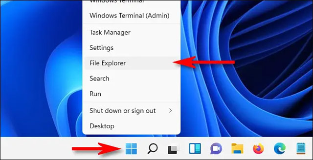 Trước tiên, hãy mở File Explorer trên PC Windows 11 của bạn bằng cách nhấp chuột vào shortcut File Explorer trên taskbar, hoặc bạn có thể nhấp chuột phải vào nút Start và chọn “File Explorer” trong menu hiện ra.