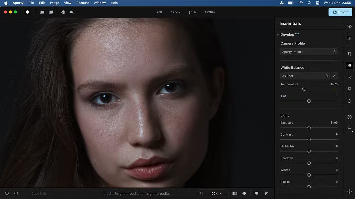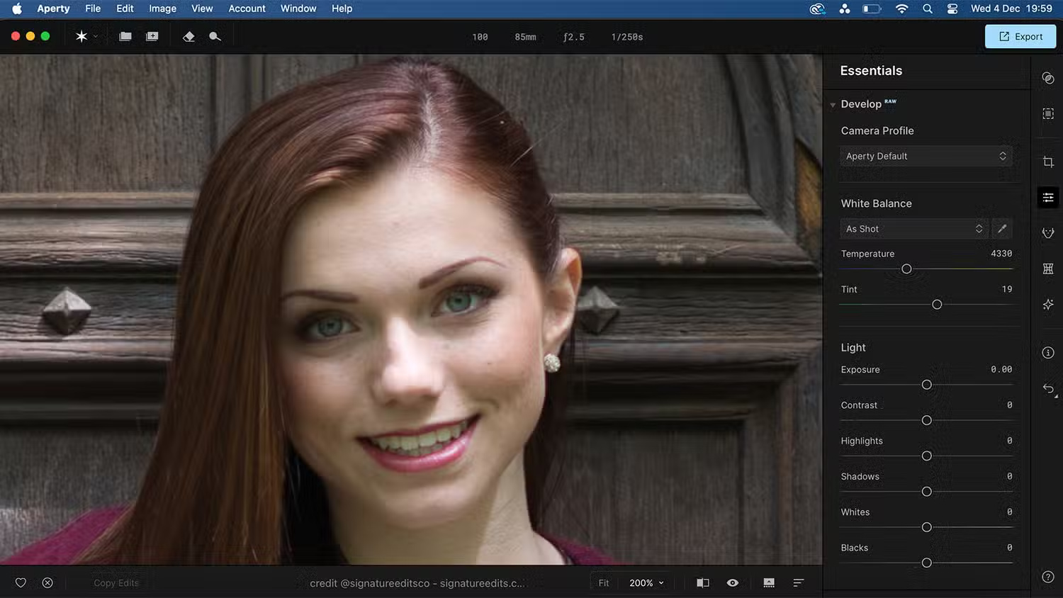 Aperty có giao diện đơn giản và hấp dẫn với các biểu tượng rõ ràng và nhãn chú giải công cụ hữu ích. Nó hiển thị thông tin cơ bản về máy ảnh phía trên hình ảnh - ISO, tiêu cự, khẩu độ và tốc độ màn trập - và tất cả các công cụ bạn cần đều nằm trong những menu dễ điều hướng ở phía bên phải.