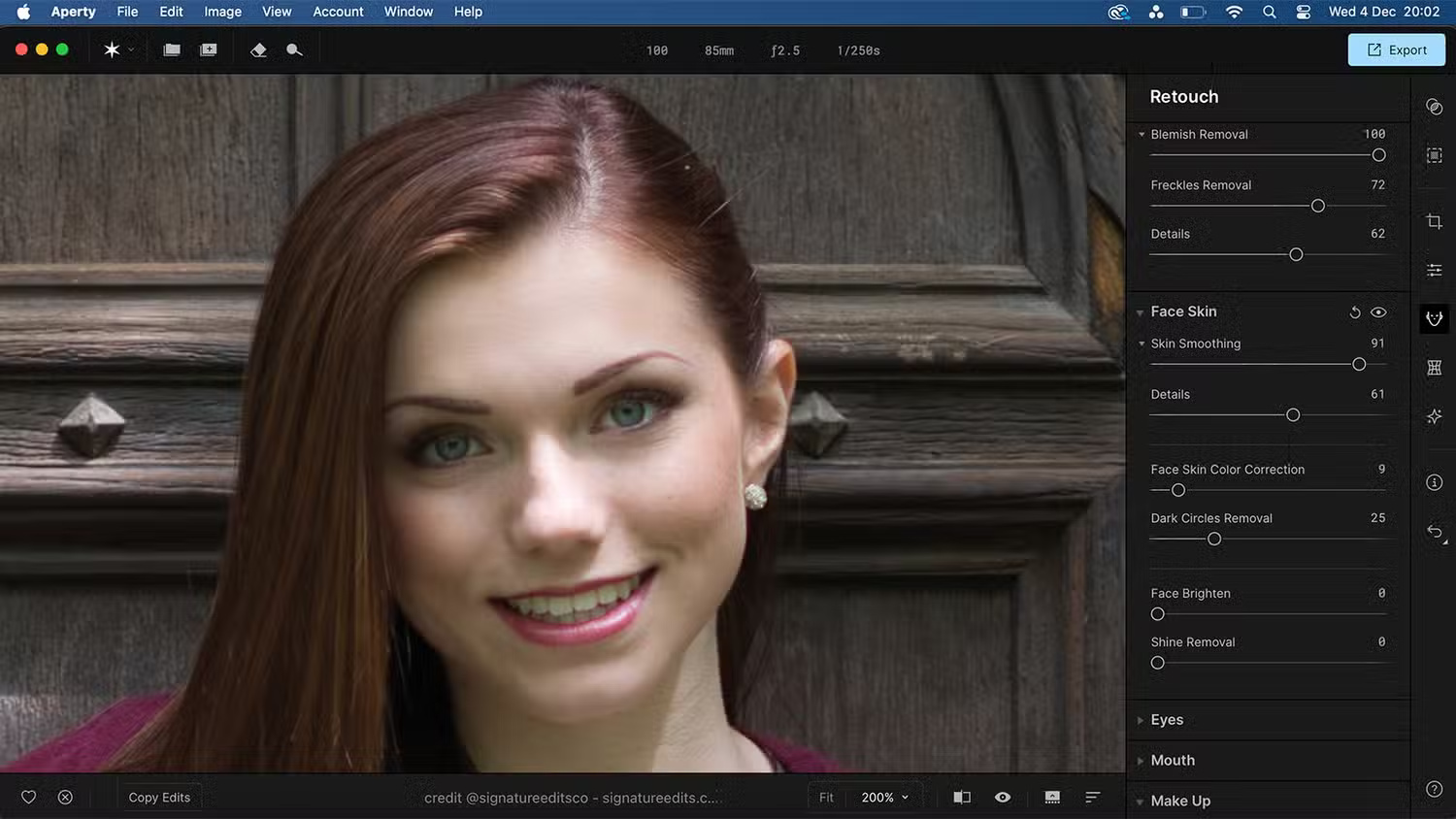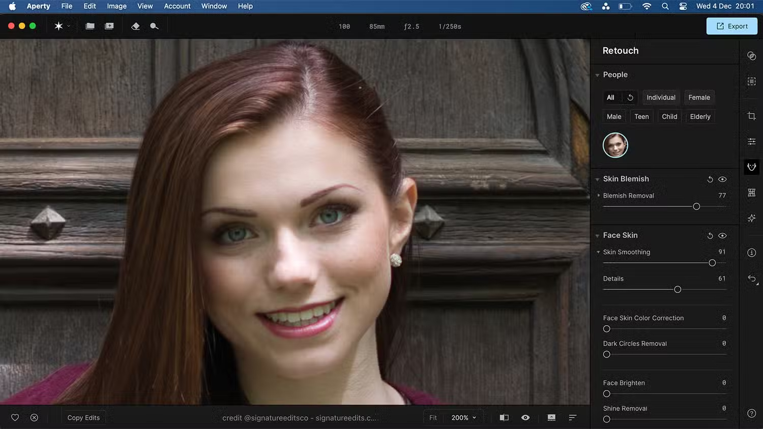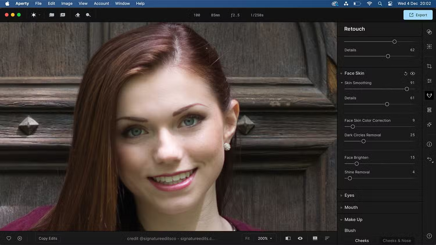Danh mục Retouch của Aperty dùng để chỉnh sửa các đặc điểm khuôn mặt trong ảnh chân dung. Chúng hoạt động tinh tế với cả thanh trượt hiệu ứng và thanh trượt chi tiết.