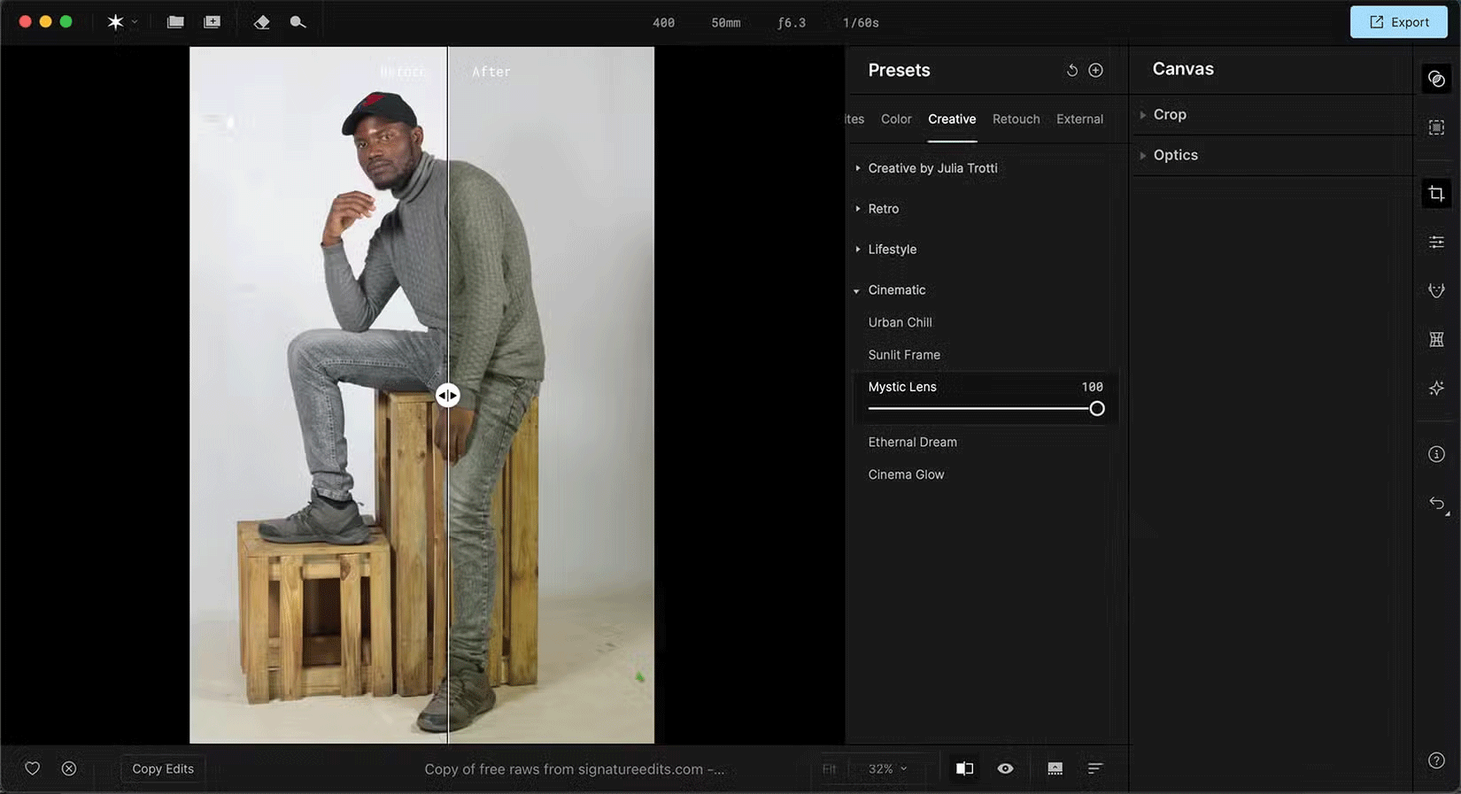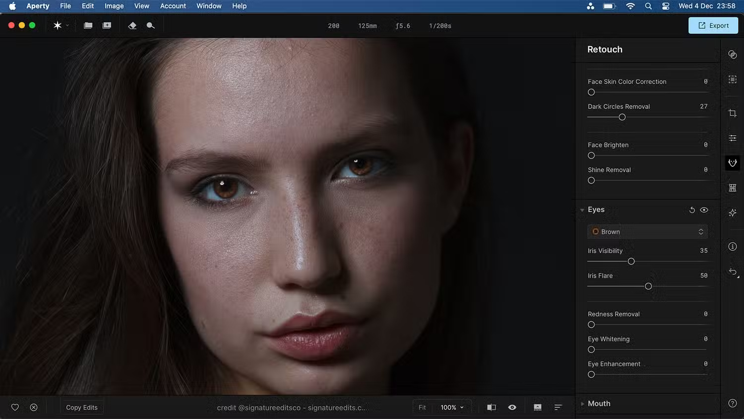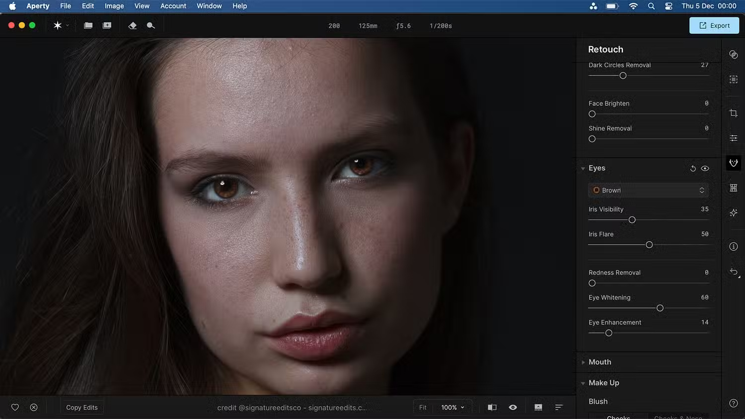Danh mục Retouch của Aperty dùng để chỉnh sửa các đặc điểm khuôn mặt trong ảnh chân dung. Chúng hoạt động tinh tế với cả thanh trượt hiệu ứng và thanh trượt chi tiết.