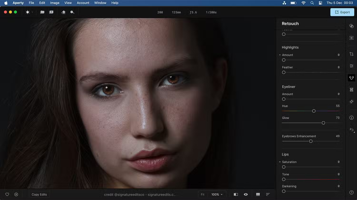 Aperty cũng có các tính năng trang điểm và định hình lại mắt. Tác giả cũng sử dụng chúng một cách tinh tế bằng cách làm nổi bật lông mày vì lông mày của người mẫu khá nhạt so với tông màu da của cô ấy. Không có sự khác biệt khi sử dụng công cụ Eyeliner.
