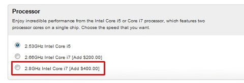 Theo đó, các model Macnbook Pro màn hình 15 và 17 inch sẽ có thêm tùy chọn bộ vi xử lý Intel Core i7 tốc độ 2,66Ghz hoặc Core i7 tốc độ 2,8 GHz với mức chi phí thêm vào là 200 và 400 USD.