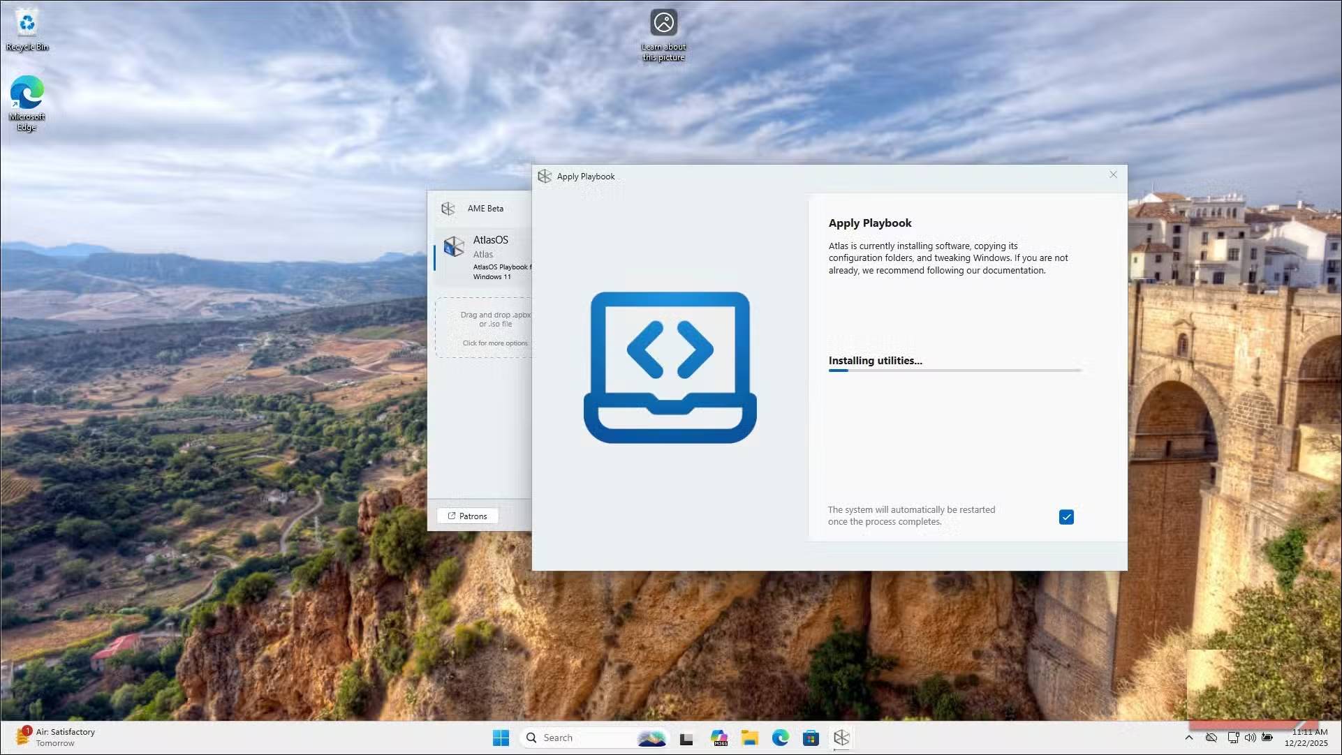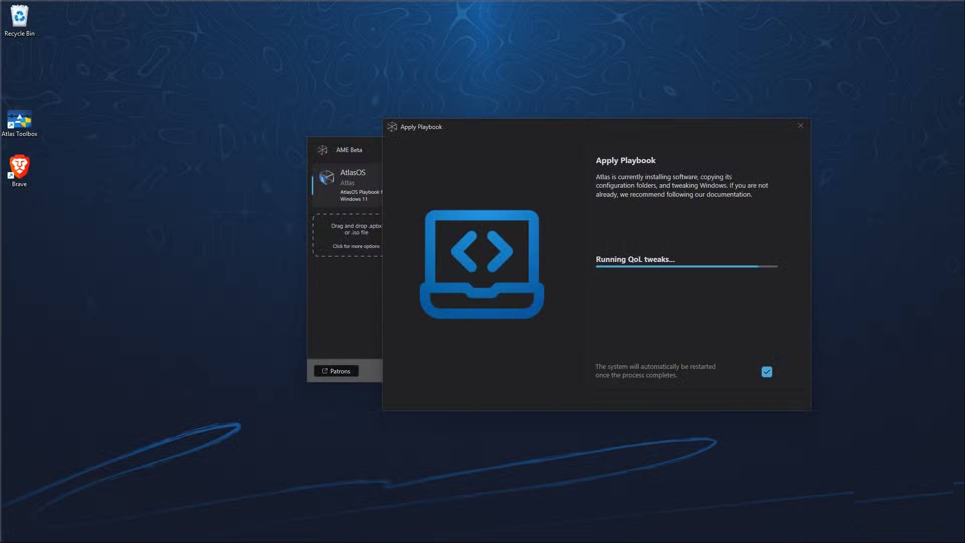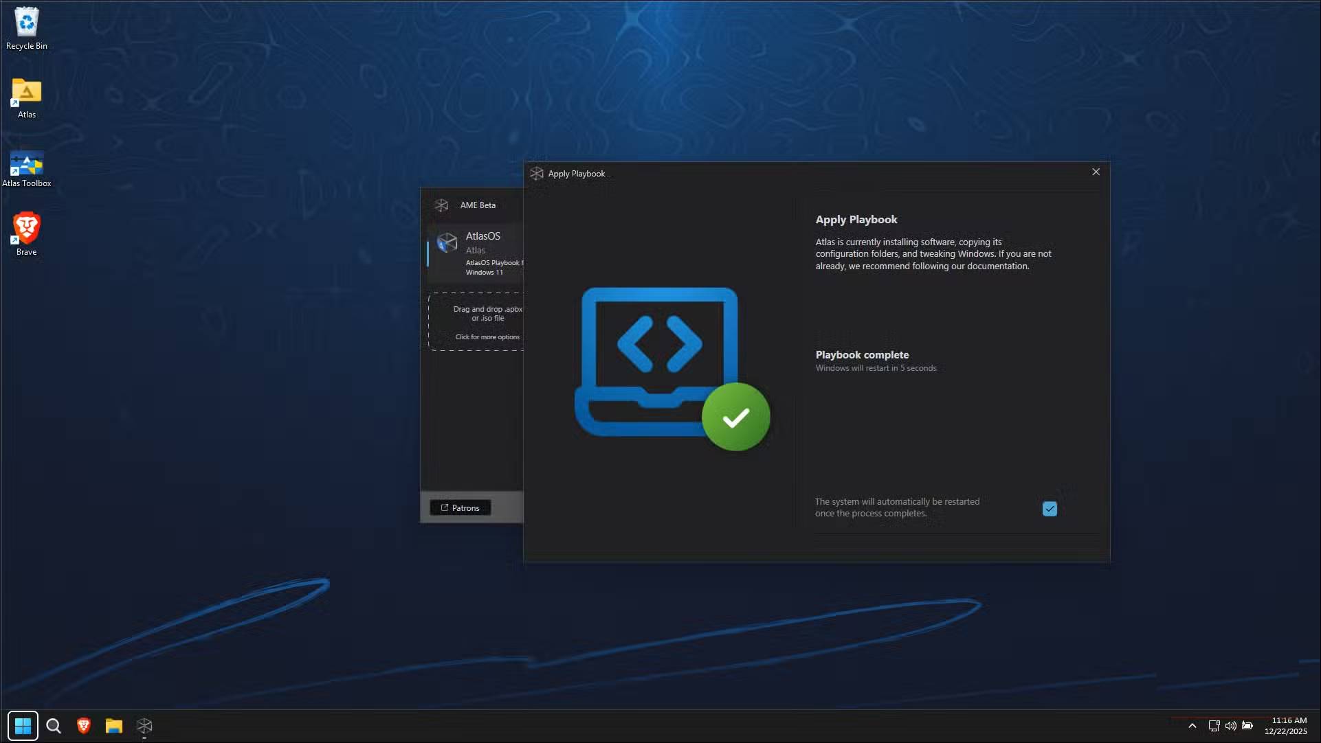 Sau khi xác nhận lựa chọn của bạn, AME Wizard sẽ áp dụng playbook. Quá trình này mất vài phút vì nó xóa, vô hiệu hóa và cấu hình các thành phần khác nhau. Khi hoàn tất, bạn sẽ thấy hình nền AtlasOS và hệ thống sẽ nhắc bạn khởi động lại. Sau khi khởi động lại, hãy mở Task Manager và bạn sẽ ngay lập tức nhận thấy ít tiến trình đang chạy hơn và mức sử dụng bộ nhớ thấp hơn.