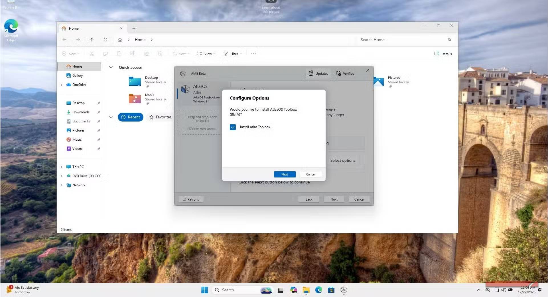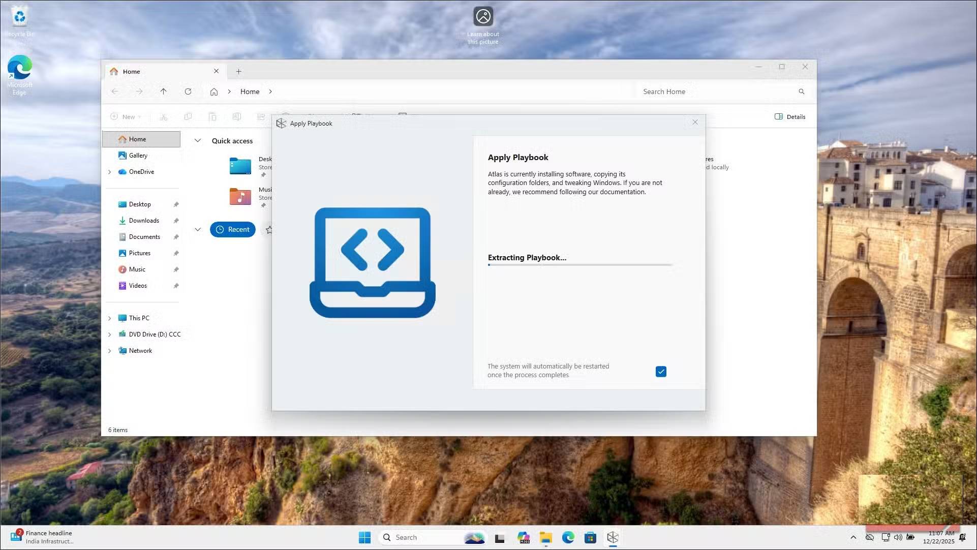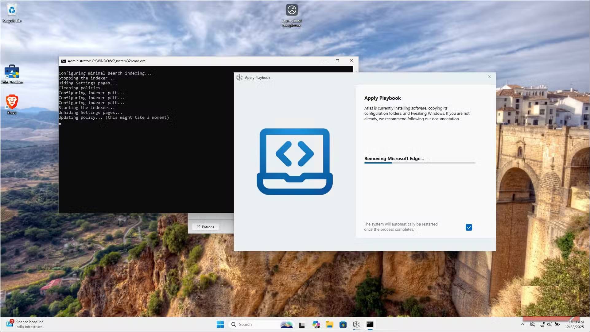 Sau khi xác nhận lựa chọn của bạn, AME Wizard sẽ áp dụng playbook. Quá trình này mất vài phút vì nó xóa, vô hiệu hóa và cấu hình các thành phần khác nhau. Khi hoàn tất, bạn sẽ thấy hình nền AtlasOS và hệ thống sẽ nhắc bạn khởi động lại. Sau khi khởi động lại, hãy mở Task Manager và bạn sẽ ngay lập tức nhận thấy ít tiến trình đang chạy hơn và mức sử dụng bộ nhớ thấp hơn.