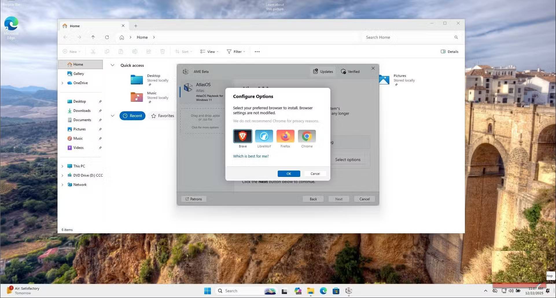 AtlasOS cũng cung cấp cho bạn quyền kiểm soát chi tiết trong quá trình cài đặt. Bạn có thể quyết định có giữ lại tính năng Windows Update, tắt chế độ ngủ đông, tắt các tính năng tiết kiệm năng lượng hoặc xóa những ứng dụng cụ thể như Snipping Tool hay không. Thậm chí, nó còn đề xuất cài đặt một trình duyệt thay thế như Brave hoặc Google Chrome trong quá trình này nếu bạn muốn loại bỏ hoàn toàn Microsoft Edge.