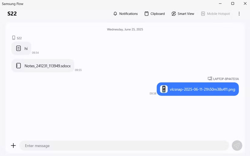 Samsung Flow mang đến trải nghiệm giống như trò chuyện, cho phép bạn thậm chí gửi tin nhắn văn bản ngắn giữa các thiết bị. Cảm giác như bạn đang nhắn tin cho chính mình. Thật tuyệt khi bạn muốn chia sẻ một liên kết nhanh hoặc ghi lại lời nhắc. Một khi đã quen với nó, thật khó để nghĩ đến việc quay lại.
