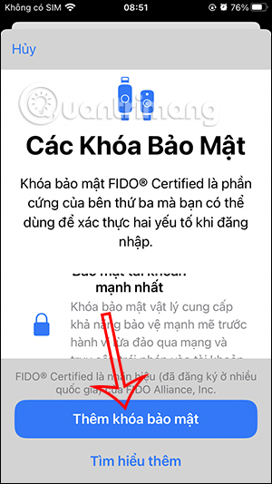 Trong giao diện tiếp theo, chúng ta nhấn vào mục Khóa bảo mật để tiến hành thiết lập. Tại đây bạn sẽ thấy thông tin giới thiệu về khóa bảo mật vật lý cho tài khoản Apple ID, chúng ta nhấn vào Thêm khóa bảo mật và thực hiện theo hướng dẫn hiển thị trên màn hình để tiếp tục.