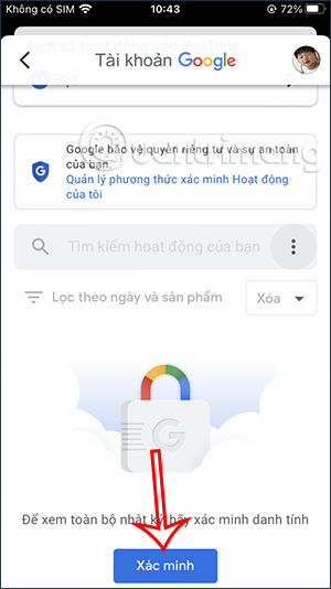 Như vậy khi muốn xem toàn bộ hoạt động trên tài khoản Google thì sẽ cần xác minh danh tính như hình dưới đây.