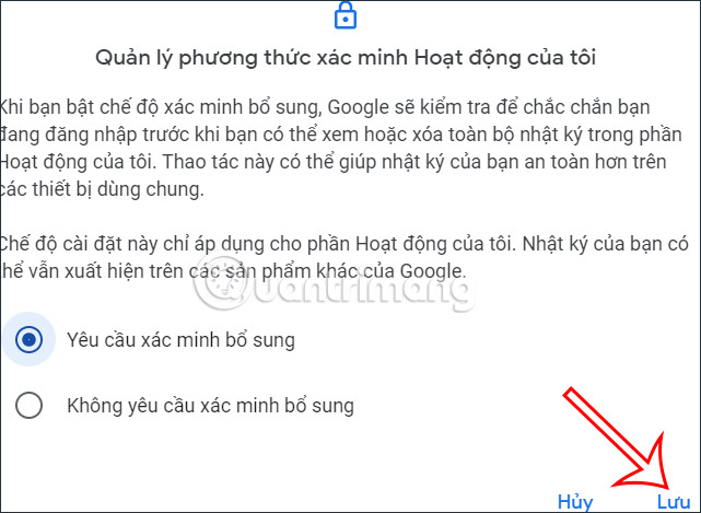 Lúc này hiển thị giao diện, chúng ta sẽ tích chọn vào Yêu cầu xác minh bổ sung rồi nhấn nút Lưu ở bên dưới giao diện.