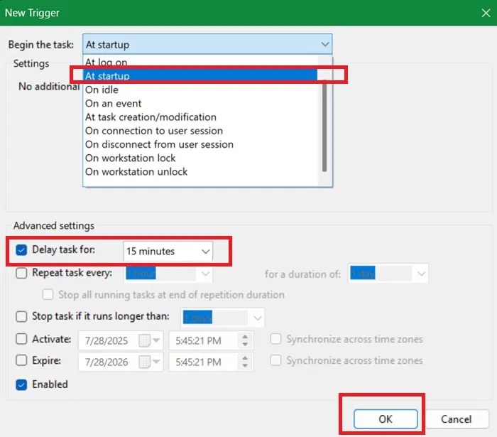 Sau khi chọn trình kích hoạt, hãy chọn hộp kiểm Delay task for, và chọn số phút từ menu drop-down. Trong trường hợp này, ví dụ trì hoãn việc khởi động chương trình trong 15 phút sau khi khởi động hệ thống. Nhấp vào OK để tiếp tục.