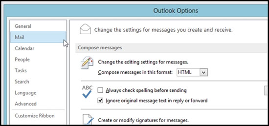 Cửa sổ "Outlook options" sẽ xuất hiện, bây giờ bạn hãy chọn nhóm thiết lập "Mail".