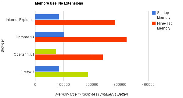 Khả năng tiết kiệm bộ nhớ: Opera vốn nổi tiếng là trình duyệt tốn ít bộ nhớ trên máy tính và điều này được chứng minh qua kết quả trên. Firefox 7 cũng xuất sắc không kém.