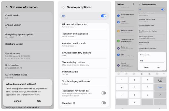 Sau khi bạn đã bật menu Developer Options trên điện thoại, hãy tìm tùy chọn Minimum width. Trên điện thoại, nó được đặt mặc định là 360, nhưng nó có thể khác nhau tùy thuộc vào kích thước và độ phân giải màn hình của bạn. Hãy nhớ ghi lại con số này. Bạn sẽ cần nó để chuyển về bố cục ban đầu.