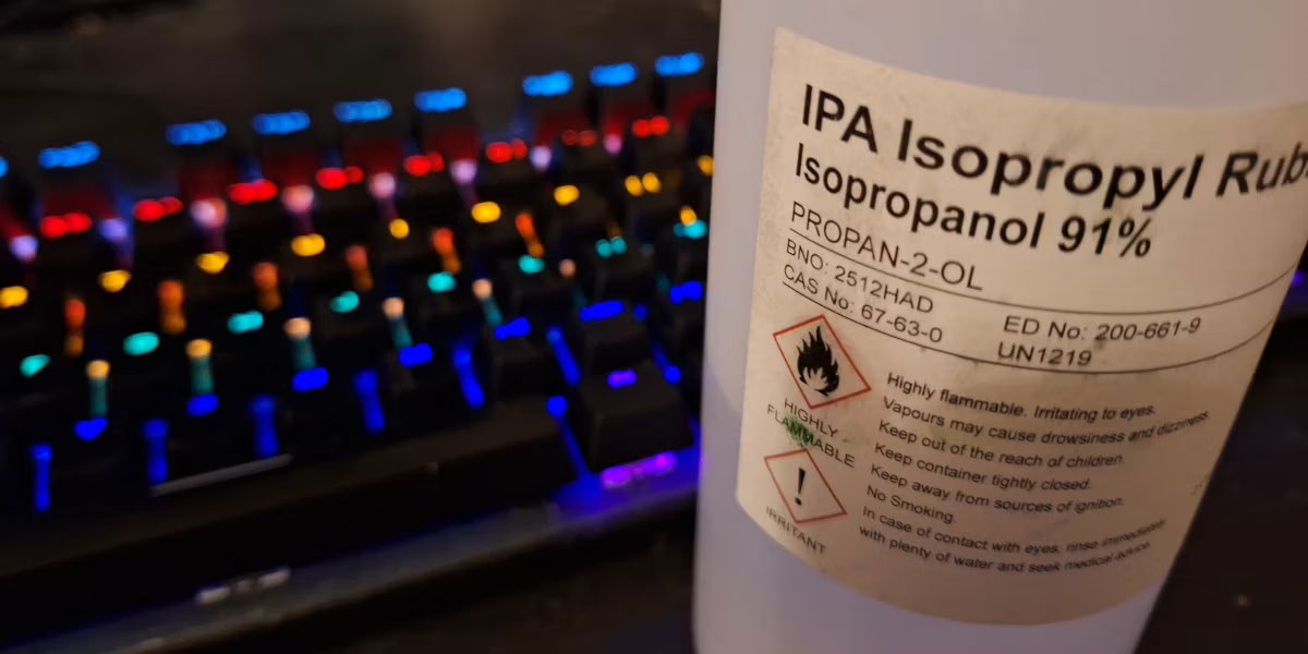 Có thể dùng cồn isopropyl cho việc này, nhưng bạn cũng có thể ngâm keycap vào nước xà phòng ấm và lau nhẹ. Sự kết hợp cồn isopropyl và khăn sợi nhỏ giúp bạn có thể tự vệ sinh tại bàn làm việc, rất tiện lợi.