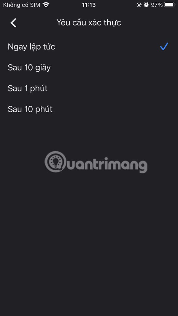 Tiếp tục bạn thiết lập mục Yêu cầu xác thực để chỉnh thời gian khóa ứng dụng Google Drive. Bạn chọn khóa ngay lập tức, hoặc thời gian khác nếu muốn.