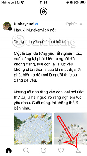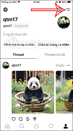 Tại giao diện trên ứng dụng Threads, người dùng nhấn vào biểu tượng hồ sơ ở bên dưới để truy cập vào giao diện Threads cá nhân của bạn. Tiếp đến, trong giao diện mới này chúng ta nhấn vào biểu tượng 3 dấu gạch ngang ở góc phải trên cùng màn hình.