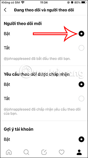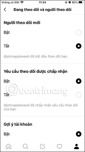 Khi đó bạn sẽ thấy tùy chọn điều chỉnh thông báo trong mục Người theo dõi mới. Nếu đang ở chế độ Tắt thì chúng ta nhấn vào Bật để nhận thông báo người theo dõi mới trên Threads cho tài khoản của bạn.