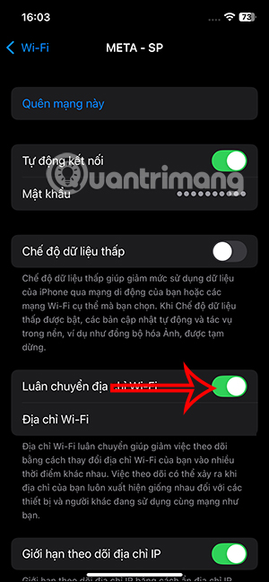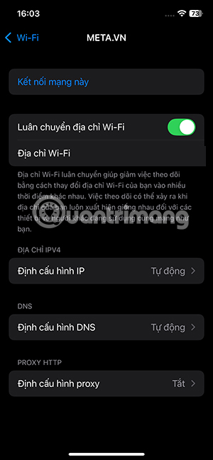 Trong giao diện này bạn tìm tới WiFi đang kết nối rồi nhấn vào biểu tượng chữ i như hình dưới đây. Hiển thị các thiết lập cho WiFi mà bạn đang kết nối trên iPhone. Chúng ta kéo xuống bên dưới và kích hoạt tùy chọn Luân chuyển địa chỉ WiFi.