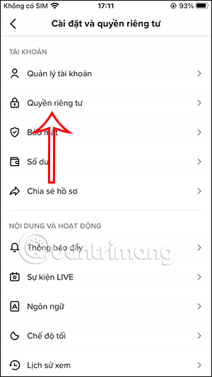 Lúc này bạn sẽ nhấn tiếp vào mục Quyền riêng tư để điều chỉnh sự riêng tư cho tài khoản TikTok của mình.