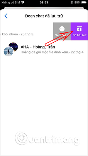 Ngay sau đó người dùng sẽ nhìn thấy toàn bộ tin nhắn Messenger đã lưu trữ trên điện thoại. Để bỏ lưu trữ tin nhắn Messenger nào thì người dùng chỉ cần vuốt từ phải sang bên trái rồi chọn Bỏ lưu trữ.