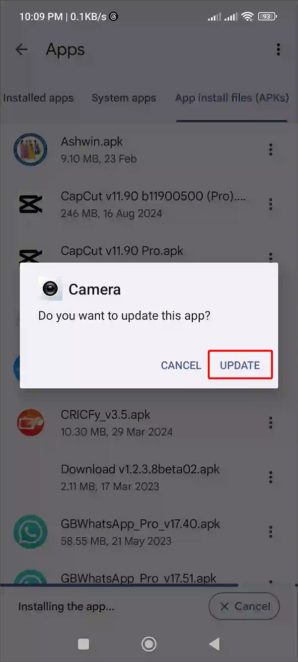 Nhấn vào tệp APK mới tải để chạy file cài đặt Xiaomi Camera 6. Tiếp tục nhấn vào Update bên dưới. Lúc này trình bảo mật trên ứng dụng tiến hành quét file để cài đặt. Sau khi quét bảo mật xong bạn chỉ cần nhấn Open để mở.